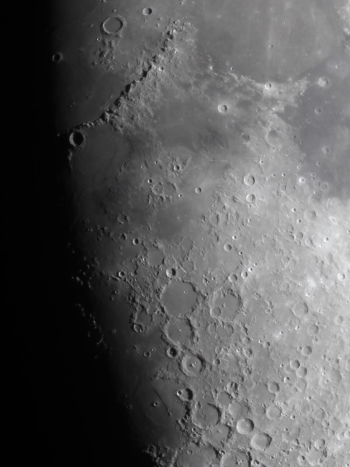 My Questar’s ability to resolve fine lunar details never disappoints me. Here is a detailed section of the above photo with Montes Apenninus as the most prominent feature in the upper left corner of the image. This is a single exposures, not a stack of multiple exposures using more sophisticated processing methods. I like keeping things simple.